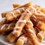 A white plate holds a pile of golden, crispy churro fries coated with a rough layer of cinnamon sugar, giving them a speckled light brown appearance. The churro fries are irregularly shaped sticks, stacked in a slightly messy way, showing the sugary texture in detail. Drizzled thinly over the top are streaks of smooth white icing, adding a soft contrast on the rough surface of the fries. The background is a soft, white marbled texture that complements the warm tones of the churro fries. photo taken with an iphone --ar 4:5 --v 7