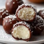 - Coat the Bites: Dip each coconut bite into the melted chocolate using a fork or toothpick, ensuring full coverage. Let any excess chocolate drip off, then place back on the parchment-lined baking sheet.