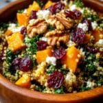 A hearty and wholesome Autumn Harvest Grain Salad featuring a nutrient-packed blend of quinoa and farro, roasted butternut squash, tart dried cranberries, crunchy walnuts, and crumbled feta cheese, all tossed in a maple syrup and olive oil dressing. Perfect for a healthy fall meal served warm or at room temperature.