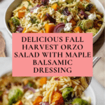 Keywords: fall salad, orzo salad, roasted butternut squash, Brussels sprouts salad, maple balsamic vinaigrette, vegetarian salad, harvest salad, autumn recipe