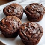 Four chocolate muffins sit close together on a round white plate, each muffin having a dark brown, cracked, slightly crispy top layer with a glossy, uneven texture showing lighter and darker chocolate shades. The muffins have a dense, moist-looking base with a rough crumb texture. The plate is placed on a white marbled surface with faint grey veins. photo taken with an iphone --ar 4:5 --v 7