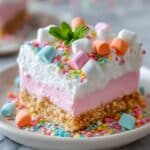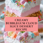 The Bubblegum Cloud Slice Dessert is a sweet, airy treat featuring a crunchy graham cracker base topped with a fluffy bubblegum-flavored cream layer and finished with colorful sprinkles and mini marshmallows. This no-bake dessert offers a fun and indulgent way to satisfy your sweet tooth with a playful bubblegum twist, perfect for parties or casual gatherings.
