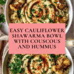 This Cauliflower Shawarma Bowl is a vibrant, healthy dish featuring spiced, roasted cauliflower served over fluffy couscous with creamy hummus and fresh cilantro garnish. It’s a perfect blend of Middle Eastern flavors, simple to prepare, and great for a nutritious lunch or dinner.
