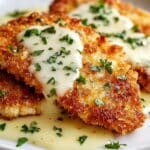 A close-up of two golden brown, breaded chicken cutlets on a white plate, each piece has crispy edges and is topped with a glossy, creamy white sauce that slightly drips down, garnished with finely chopped green herbs scattered on top and around the plate. The texture of the chicken shows a crunchy crust with a soft inside. The white plate rests on a white marbled surface. photo taken with an iphone --ar 4:5 --v 7