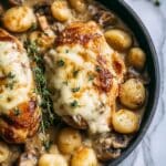 In a shallow, round black pan, two golden brown chicken breasts sit on a bed of light brown creamy sauce mixed with sautéed mushrooms in a rich gravy. The chicken breasts are topped with melted white cheese that is bubbling and slightly browned in areas, with fresh green thyme sprigs scattered on top. Around the chicken, small round pieces of potato with a golden crust float in the sauce. The pan rests on a white marbled surface. photo taken with an iphone --ar 4:5 --v 7
