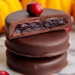 This delightful Thanksgiving treat features smooth jellied cranberry sauce discs coated in rich dark chocolate, creating a perfect balance of tart and sweet. Frozen to firm up the cranberry slices and then dipped in melted chocolate, these bite-sized snacks are easy to make and ideal for holiday snacking or gifting.