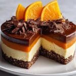 This decadent Chocolate Orange Cheesecake combines a rich and creamy cream cheese filling infused with zesty fresh oranges and smooth dark chocolate, all resting on a buttery graham cracker crust. Perfectly balanced with the bright citrus notes and the deep cocoa flavor, this no-bake cheesecake is chilled to set and garnished elegantly with melted chocolate and orange slices for a stunning dessert that’s sure to impress.