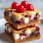 The image shows two square dessert bars stacked on a white plate. Each bar has a golden brown crust as the bottom layer, with a soft, slightly crumbly texture visible. Above the crust is a layer filled with melted chocolate chunks and white marshmallow pieces, giving a mix of smooth and fluffy textures with dark and bright white colors. Scattered bits of red fruit pieces, likely cherries or cranberries, are embedded within this middle layer. The top layer has a golden, slightly glossy finish with four bright red cherries placed on the upper bar. The background features a white marbled surface, creating a clean and bright presentation. photo taken with an iphone --ar 4:5 --v 7