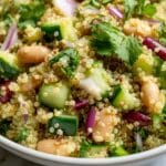 This refreshing Cilantro Lime Quinoa Salad is a vibrant and nutritious dish featuring fluffy quinoa, white beans, crisp cucumber, and red onion, all tossed in a zesty cilantro lime dressing made from fresh herbs, lime juice, and a hint of maple syrup. Ready in under 30 minutes, it’s perfect as a light meal or a flavorful side.