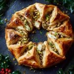 This Cranberry and Brie Puff Pastry Wreath is a festive and elegant appetizer perfect for holiday gatherings. Featuring a flaky puff pastry base layered with tangy cranberry sauce, creamy Brie cheese, and crunchy pistachios, it’s baked to a golden perfection and makes a stunning centerpiece that’s both delicious and visually appealing.