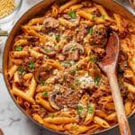 This Mushroom Pasta recipe features a medley of Baby Bella, white, and portabello mushrooms sautéed with aromatic shallots and garlic, simmered in a savory tomato and red wine sauce, and tossed with al dente short pasta. Finished with parmesan, fresh parsley, and crunchy walnuts, this dish offers a flavorful, hearty, and comforting Italian-inspired vegetarian meal perfect for any occasion.