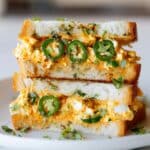 Two thick open-faced sandwiches stacked on a white plate with a white marbled background, each sandwich has three visible layers: the bottom layer is soft white bread with a golden crust, the middle layer consists of sliced green jalapeños and chopped green herbs, and the top layer is a creamy orange spread mixed with finely chopped white pieces of boiled egg and green herbs, lightly browned on top. The top sandwich is tilted slightly backward, showing the layers clearly. Photo taken with an iphone --ar 4:5 --v 7