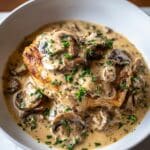 A white bowl holds a thick piece of browned chicken breast at the center, covered with a creamy mushroom sauce that has a light beige color with specks of black pepper. Sliced mushrooms with a dark brown color are mixed throughout the sauce and rest on top of the chicken, adding texture and depth. The dish is sprinkled with finely chopped bright green parsley, adding a fresh touch of color. The creamy sauce pools around the chicken within the bowl, creating a rich and smooth base. The setting includes a white marbled texture surface visible at the edges. Photo taken with an iphone --ar 4:5 --v 7