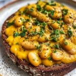 A close-up of one round toasted slice of dark brown bread placed on a white plate with a speckled pattern around the edges, sitting on a white marbled surface. On top of the bread is a thick layer of creamy yellow bean curry with visible whole white beans covered in a smooth sauce. The curry is sprinkled with finely chopped fresh green herbs and small black pepper specks, adding texture and color contrast. The sauce has a glossy, rich texture, slightly spilling over the edges of the bread, making it look hearty and fresh. Photo taken with an iphone --ar 4:5 --v 7