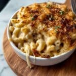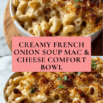 This Decadent French Onion Soup Mac & Cheese Comfort Bowl combines the rich, caramelized flavor of French onion soup with creamy, cheesy mac and cheese for a comforting and indulgent dish. Slowly caramelized onions, melted Gruyère and sharp white cheddar create a luscious sauce, perfectly coating al dente elbow macaroni. Optional toasted baguette slices and extra cheese topping add a crunchy, golden finish reminiscent of classic French onion soup.