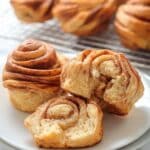 The image shows three cinnamon rolls on a white plate with one roll broken in half, revealing a soft, fluffy inside with visible swirls of cinnamon filling. Each roll has multiple twisted layers of golden-brown dough with darker cinnamon stripes on the surface that create a textured, spiral pattern. In the background, more cinnamon rolls sit on a cooling rack, slightly blurred. The whole scene is set against a white marbled surface, highlighting the warm, inviting colors of the rolls. photo taken with an iphone --ar 4:5 --v 7