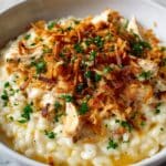 This French Onion Chicken Orzo Casserole combines the rich, caramelized flavor of onions with tender shredded chicken and creamy cheeses, all baked to bubbly perfection. It features orzo pasta simmered in chicken broth and cream, mingled with savory herbs, resulting in a comforting, hearty casserole perfect for a family dinner or cozy night in.