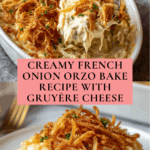 Keywords: French Onion Bake, Orzo Pasta, Caramelized Onions, Gruyère Cheese, Baked Pasta, Comfort Food, One-pan Dish