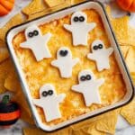 - Add Eyes and Serve: Once removed from the oven, use black decorating gel or place mini olive pieces to dot each ghost with eyes, bringing them to life. Serve the dip warm with your choice of chips, crackers, or veggies.