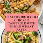 Keywords: broccoli chicken casserole, healthier casserole, whole wheat pasta casserole, baked chicken casserole, mushroom and cheese casserole