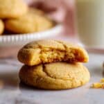 Two soft, golden-brown cookies rest on a white marbled surface, one cookie stacked on top of the other. The top cookie has a large bite taken out of it, showing a moist and slightly crumbly inside texture with sugar crystals glistening on the surface. In the blurred background, a white plate holds more cookies, and a glass of milk is partially visible, creating a warm and cozy scene. Photo taken with an iphone --ar 4:5 --v 7