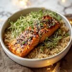 This Honey Glazed Salmon Bowl is a simple, flavorful dish perfect for a nutritious weeknight meal. Sweet honey complements tender salmon, served over wholesome brown rice and fresh alfalfa sprouts for a light, satisfying bowl.