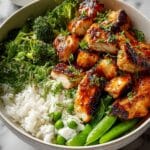 This Hot Honey Chicken Bowl features crispy, juicy fried chicken thighs tossed in a spicy-sweet hot honey sauce, served over a bed of fluffy rice with creamy avocado, tangy pickled red onions, and green onions for freshness. It’s an addictive combination of heat, honey sweetness, and savory flavors that makes for a perfect comfort food meal with a kick.