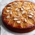 A round, single-layer golden brown cake with a slightly crisp edge sits on white parchment paper on a white plate. The top of the cake is textured with irregular, glossy slices of light yellow fruit embedded into the warm, shiny surface. Thin almond slices are scattered unevenly on top, adding contrast with their pale beige color and smooth texture. Coarse sugar crystals sparkle lightly over the whole cake, giving it a subtle shine. The background is a soft white marbled texture. photo taken with an iphone --ar 4:5 --v 7