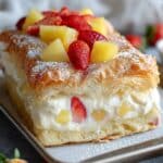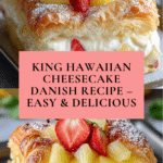 This Irresistible King Hawaiian Cheesecake Danish combines soft, sweet King Hawaiian rolls with a creamy cheesecake filling, topped with crushed pineapple and fresh strawberries. Finished with a smooth vanilla glaze, this delightful dessert is perfect for breakfast, brunch, or any special occasion.