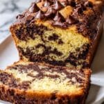A loaf of chocolate chip cake is placed on a white plate on a white marbled surface. The cake has two visible layers inside: a light yellow sponge mixed with dark chocolate chips that are spread throughout, creating a spotted pattern. The top layer is golden brown and sprinkled with large, melted chocolate chips that add a glossy texture. One slice of the cake is cut and positioned in front of the loaf, showing the same marbled chocolate and yellow texture inside. The cake looks moist with a slightly crunchy, dark brown crust around the edges. photo taken with an iphone --ar 4:5 --v 7