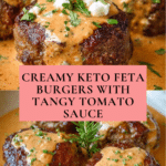 Keywords: Keto burgers, feta cheese burgers, tomato cream sauce, low carb dinner, keto dinner, creamy sauce burger, ground beef recipe