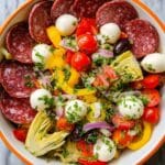 - Chop and Combine the Stars: Grab a large bowl and chop the deli-sliced pepperoni and salami into bite-sized pieces. If mozzarella pearls are large, halve them; otherwise, leave as is. Drain and chop the pepperoncini peppers and artichoke hearts. Halve the cherry tomatoes and chop the Kalamata olives. Add all these ingredients into the bowl and mix well to evenly distribute.