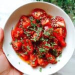 Lebanese Tomato Salad is a fresh and vibrant dish featuring juicy campari tomatoes tossed with a flavorful smoky paprika and sumac dressing made from roasted red bell pepper and garlic. Finished with fresh parsley, this salad is a perfect light appetizer or side dish that bursts with Mediterranean flavors.