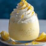 The image shows a dessert in a clear round glass with two main layers: a thick pale yellow creamy base layer with tiny bubbles and a fluffy white whipped cream topping swirled in a soft peak. Thin strips of bright yellow lemon zest are scattered over the whipped cream and a few around the glass on a white plate. The background features a soft dark blue color, while the surface is a white marbled texture. photo taken with an iphone --ar 4:5 --v 7