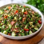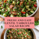 A vibrant and healthy Lentil Tabbouleh salad featuring cooked lentils combined with fresh herbs, cucumber, tomatoes, and a zesty lemon-olive oil dressing. This gluten-free, protein-packed dish is refreshing and perfect as a light meal or side.