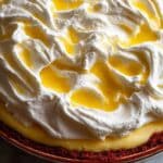 The dish is a close-up view of a pie with three visible layers. The bottom layer is a dark brown crust with a slightly rough texture. The middle layer is smooth and pale yellow, likely a lemon filling. On top, there is a thick, fluffy layer of white whipped cream spread unevenly with swirls and peaks. Pockets of bright yellow sauce or glaze are drizzled in between the whipped cream, creating a shiny contrast. The pie is set on a white marbled surface. photo taken with an iphone --ar 4:5 --v 7