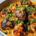 The image shows several browned, round chicken pieces covered in a thick orange sauce on a white plate. The chicken has dark grill marks and a slightly crispy texture. On top, small green chopped scallions are sprinkled evenly, adding a fresh contrast to the orange sauce. The sauce looks creamy and smooth, pooling gently around the chicken pieces. The background is a white marbled surface. photo taken with an iphone --ar 4:5 --v 7