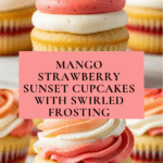 Keywords: Mango cupcakes, strawberry cupcakes, fruity cupcakes, sunset swirl frosting, tropical cupcakes, dessert recipe, homemade cupcakes