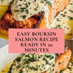 Enjoy a delicious and easy-to-make baked Boursin salmon recipe that is tender, flavorful, and ready in just 20 minutes. This dish features omega-3 rich salmon fillets topped with creamy Boursin cheese, garlic, lemon zest, and herbs, making it perfect for a healthy weeknight dinner or special occasion.