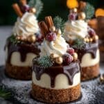 These Mini Christmas Drip Cakes with Chocolate Ganache & Festive Toppings combine tender sponge cakes with a rich, glossy chocolate ganache, topped with light whipped cream and festive decorations. Perfect for holiday celebrations, these individual cakes bring together simple pantry staples into an impressive and delicious dessert, complete with fresh cranberries, cinnamon sticks, and edible gold accents for a magical Christmas touch.