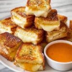A white plate is filled with several mini grilled cheese sandwiches stacked in two layers, each sandwich cut into small square pieces. The top and bottom layers are toasted golden brown with a slightly crispy texture, sprinkled lightly with herbs. The middle layer shows melted cheese in shades of creamy white and golden yellow, oozing slightly out from between the toasted bread slices. On the side of the plate, there is a small white bowl filled with smooth, reddish-orange dipping sauce. The plate is placed on a white marbled surface. photo taken with an iphone --ar 4:5 --v 7