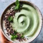 - Serve and garnish: Pour the smoothie into a glass and top with extra fresh mint leaves, cacao nibs, plant-based yogurt, and chia seeds for added texture and nutritional benefits.