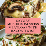 A hearty and flavorful Mushroom Swiss Cheese Meatloaf combining ground beef and pork with sautéed mushrooms, crispy bacon, and melted Swiss cheese. This classic comfort food is topped with a tangy ketchup glaze and baked to perfection, making it perfect for a satisfying family dinner.