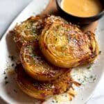 Oven Roasted Garlic Cabbage Steaks are a delicious and healthy side dish featuring thick-cut cabbage rounds seasoned with a flavorful blend of garlic, smoked paprika, and herbs, then roasted to tender perfection with a crispy, caramelized exterior. This simple, vegan recipe is perfect for a nutritious addition to any meal and can be customized with optional toppings like Parmesan cheese or fresh parsley.