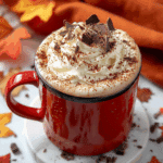 A red mug filled with a rich hot chocolate has a thick layer of creamy white whipped cream swirled on top, dusted with fine cocoa powder and sprinkled with irregular dark chocolate shavings. The mug sits on a small, round white marbled coaster, with some chocolate pieces scattered around. In the blurry background, there are autumn leaves in warm orange and yellow tones and a soft orange cloth, creating a cozy fall atmosphere. The lighting highlights the smooth, glossy texture of the mug and the light, fluffy texture of the whipped cream. photo taken with an iphone --ar 4:5 --v 7