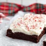 These Peppermint Bark Brownies combine rich, fudgy dark chocolate brownies with a smooth white chocolate peppermint frosting and crushed candy canes for a festive, indulgent treat perfect for the holiday season.