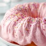 PrintPink Angel Food Cake with Marshmallow Frosting and Rainbow Sprinkles Recipe