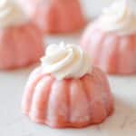The image shows a small pink dessert shaped like a mini bundt cake with soft ridges running vertically along its sides. The base is smooth with a slightly glossy texture, and it is topped with a swirl of creamy white frosting that has a soft, fluffy appearance. There are more similar desserts blurred in the background, all placed on a white marbled surface. photo taken with an iphone --ar 4:5 --v 7