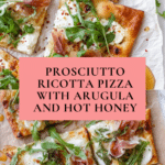Keywords: Prosciutto Ricotta Pizza, homemade pizza, pizza recipe, Italian pizza, mozzarella pizza, ricotta pizza, arugula pizza, hot honey pizza