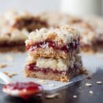 The image shows two dessert bars stacked on top of each other on a dark surface. Each bar has three visible layers: a bottom layer of light golden brown crumbly crust, a middle layer of dark red jam that looks sticky and thick, and a top layer that is creamy white with a rough texture, likely shredded coconut or oats mixed with a light batter. Around the bars, there are small crumbs and oats scattered. In the foreground, a white spoon with red jam on it lies blurred on the white marbled surface. The background is softly blurred, showing more bars and a white container. photo taken with an iphone --ar 4:5 --v 7